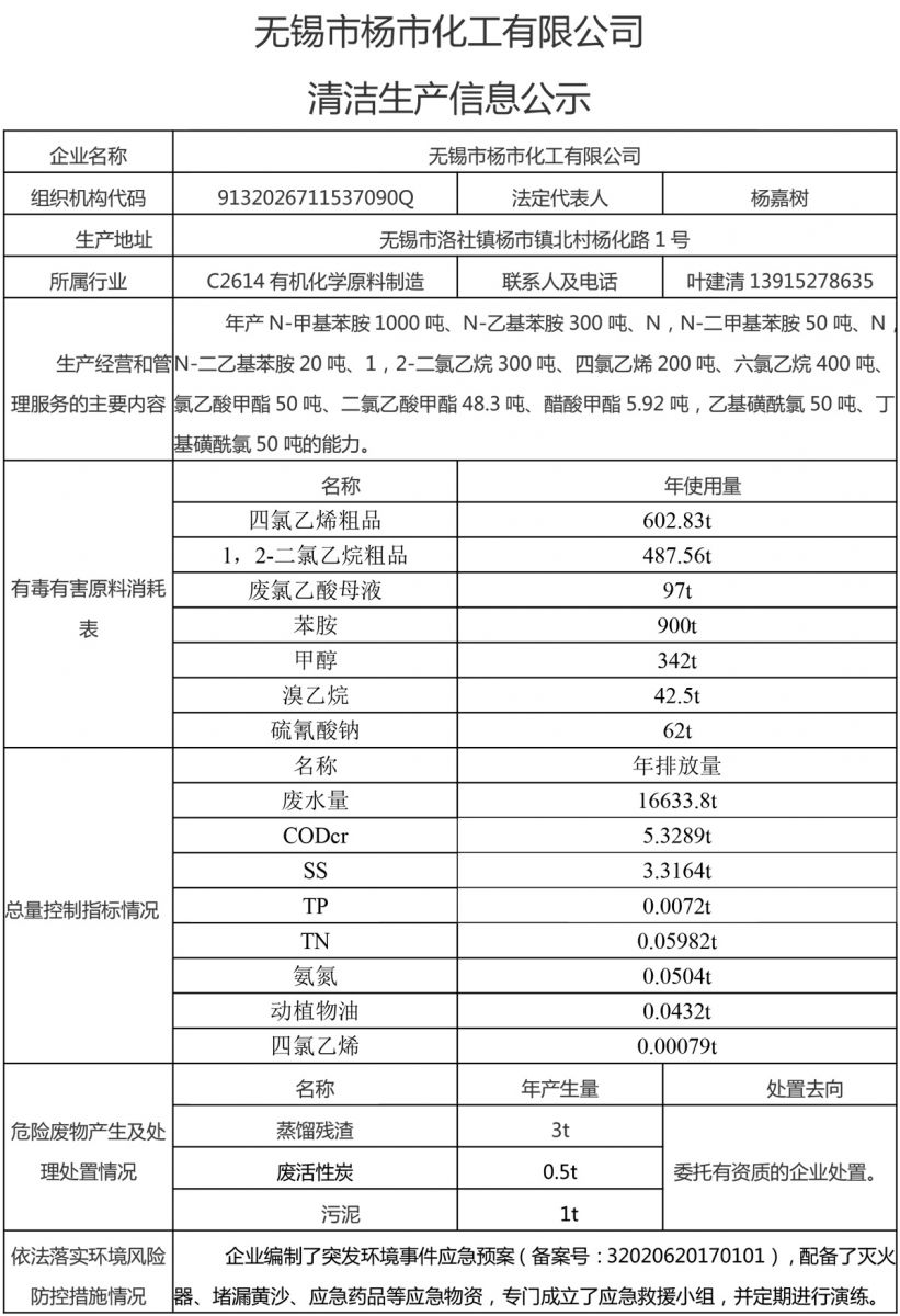 無錫市楊市化工有限公司清潔生產(chǎn)信息公示